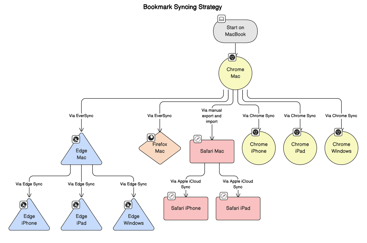 I still use Chrome as my “primary” browser, but now on a MacBook instead of a Windows laptop. From Chrome, my bookmarks radiate out to other browsers via various methods, including EverSync, native browser sync, and even export/import.